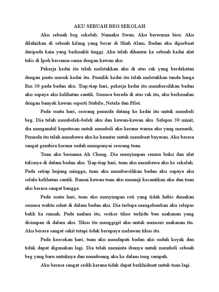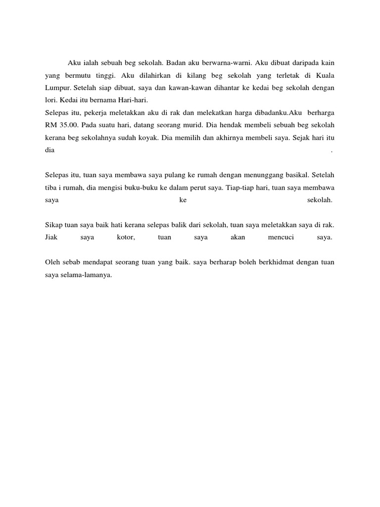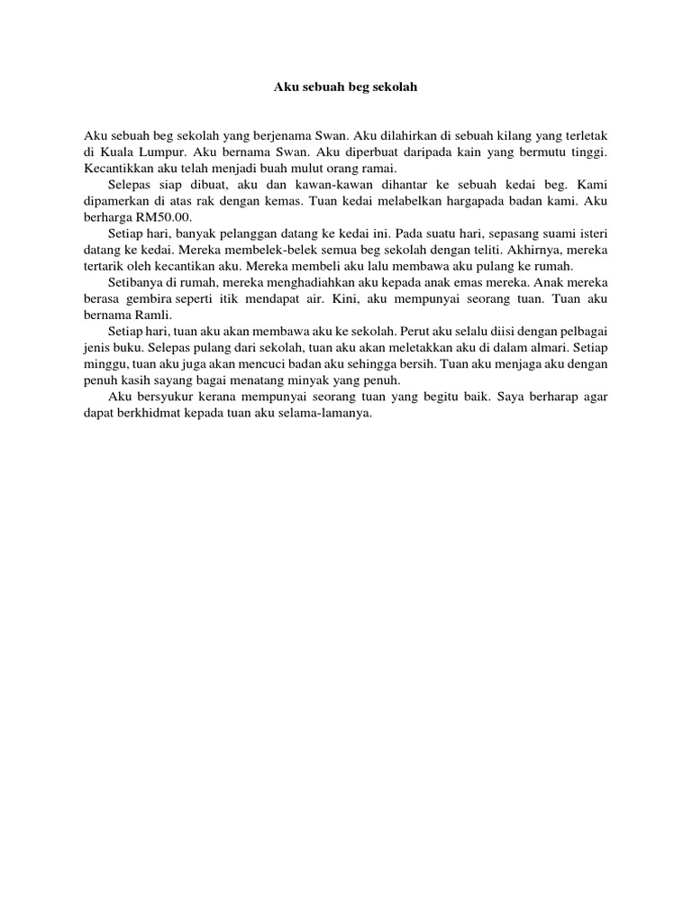 Aku sepasang kasut sekolahaku berjenama pallas aku dibuat di sebuah kilang yang terletak di putrajayaaku. Karangan Pendek-Aku Sebuah Beg Sekolah Karangan Pendek Tingkatan 1 ID. Dia hanya memiliki sebuah beg yang telah koyak.