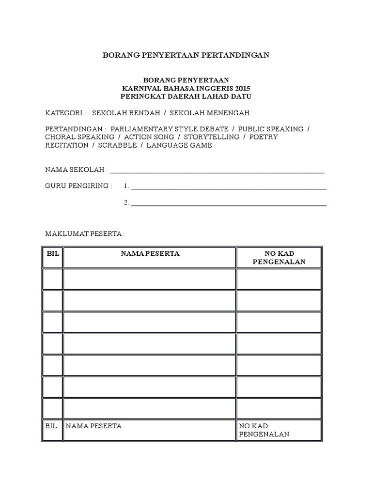 Penyertaan akan terbatal jika terdapat maklumat yang tidak benar. Contoh borang penyertaan pertandingan menyanyi sekolah rendah. Borang Penyertaan Sukan Tabika Pdf RM500 1500 Mata Penyertaan 3 kali ganda melalui SPG.